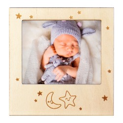 Marco de madera infantil. Para foto 9x13 y 10x15 horizontal. Posibilidad de pedir el marco grabado sobre la madera. En caso de pedir el marco grababado se realizará en la parte superior de la siguiente manera: Lia 31-Mayo-2023 Si lo desea en otro formato, indiquelo en el campo observaciones del grabado.