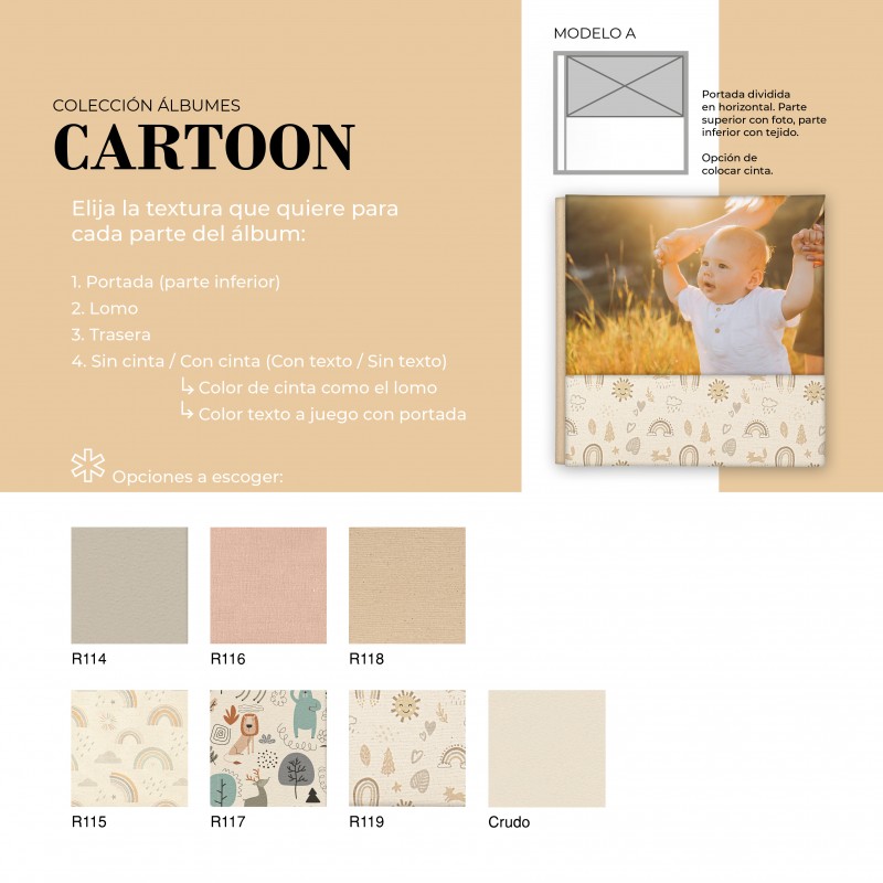 El Álbum Digital Cartoon es una opción cuidada y versátil para quienes buscan un acabado elegante y totalmente personalizable. Su diseño permite combinar diferentes texturas en portada, lomo y trasera, adaptándose al estilo de cada proyecto. Además, puede realizarse con o sin cinta decorativa, la cual puede ir personalizada con nombre, aportando un detalle único y especial.