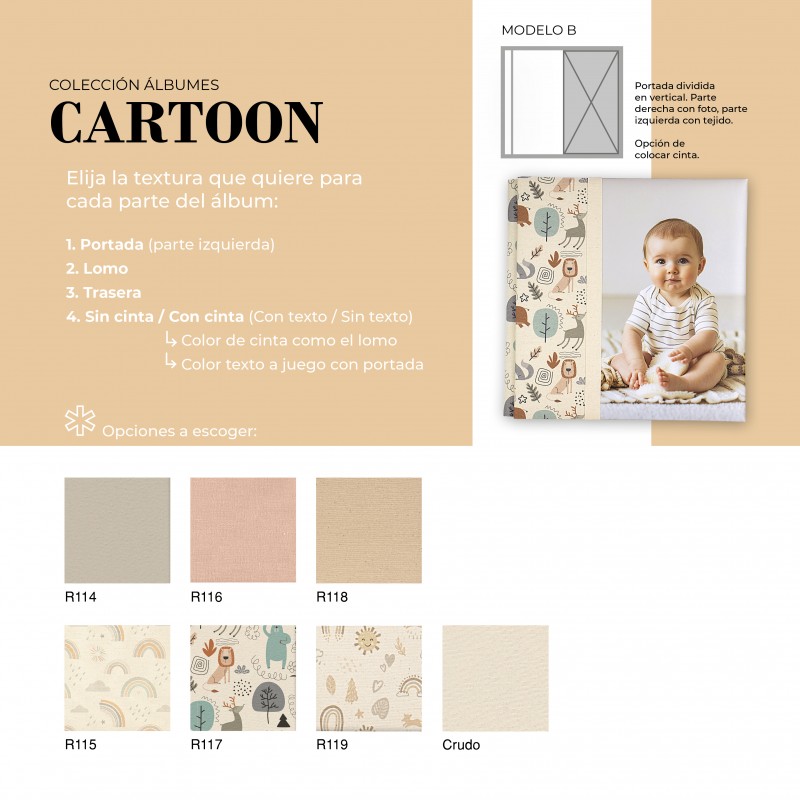 El Álbum Digital Cartoon es una opción cuidada y versátil para quienes buscan un acabado elegante y totalmente personalizable. Su diseño permite combinar diferentes texturas en portada, lomo y trasera, adaptándose al estilo de cada proyecto. Además, puede realizarse con o sin cinta decorativa, la cual puede ir personalizada con nombre, aportando un detalle único y especial.