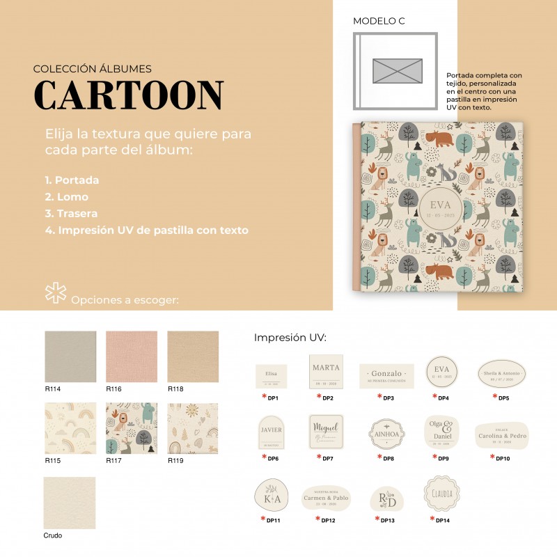 El Álbum Digital Cartoon es una opción cuidada y versátil para quienes buscan un acabado elegante y totalmente personalizable. Su diseño permite combinar diferentes texturas en portada, lomo y trasera, adaptándose al estilo de cada proyecto. Además, puede realizarse con o sin cinta decorativa, la cual puede ir personalizada con nombre, aportando un detalle único y especial.