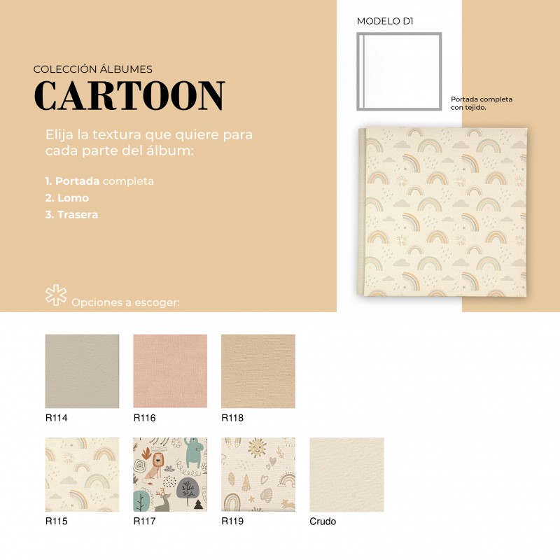 El Álbum Digital Cartoon es una opción cuidada y versátil para quienes buscan un acabado elegante y totalmente personalizable. Su diseño permite combinar diferentes texturas en portada, lomo y trasera, adaptándose al estilo de cada proyecto. Además, puede realizarse con o sin cinta decorativa, la cual puede ir personalizada con nombre, aportando un detalle único y especial.