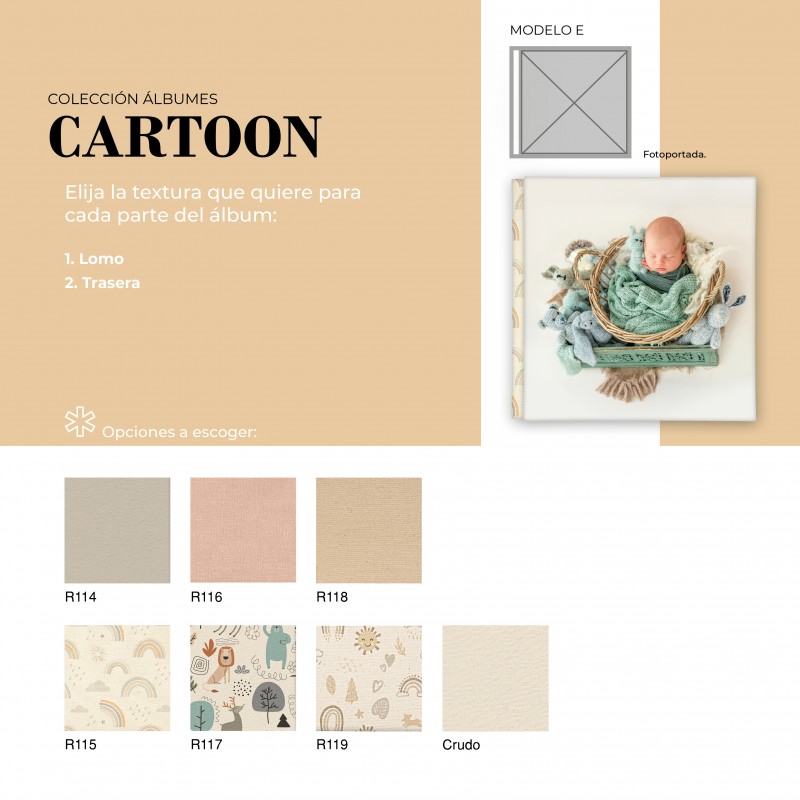 El Álbum Digital Cartoon es una opción cuidada y versátil para quienes buscan un acabado elegante y totalmente personalizable. Su diseño permite combinar diferentes texturas en portada, lomo y trasera, adaptándose al estilo de cada proyecto. Además, puede realizarse con o sin cinta decorativa, la cual puede ir personalizada con nombre, aportando un detalle único y especial.