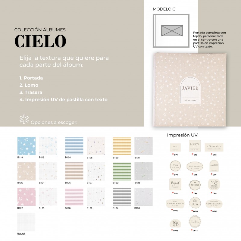El Álbum Digital Cielo es una opción cuidada y versátil para quienes buscan un acabado elegante y totalmente personalizable. Su diseño permite combinar diferentes texturas en portada, lomo y trasera, adaptándose al estilo de cada proyecto. Además, puede realizarse con o sin cinta decorativa, la cual puede ir personalizada con nombre, aportando un detalle único y especial.