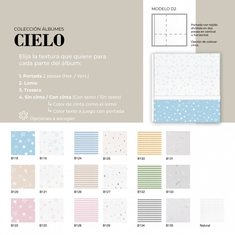 El Álbum Digital Cielo es una opción cuidada y versátil para quienes buscan un acabado elegante y totalmente personalizable. Su diseño permite combinar diferentes texturas en portada, lomo y trasera, adaptándose al estilo de cada proyecto. Además, puede realizarse con o sin cinta decorativa, la cual puede ir personalizada con nombre, aportando un detalle único y especial.