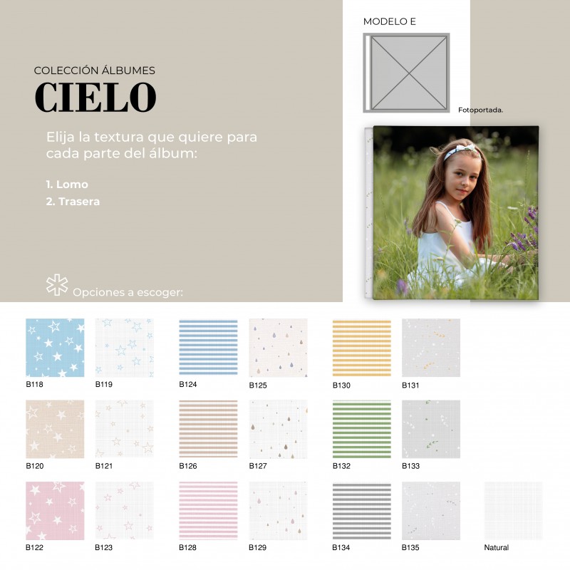 El Álbum Digital Cielo es una opción cuidada y versátil para quienes buscan un acabado elegante y totalmente personalizable. Su diseño permite combinar diferentes texturas en portada, lomo y trasera, adaptándose al estilo de cada proyecto. Además, puede realizarse con o sin cinta decorativa, la cual puede ir personalizada con nombre, aportando un detalle único y especial.