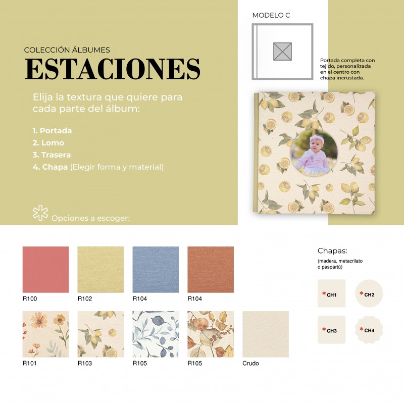 El Álbum Digital Estaciones es una opción cuidada y versátil para quienes buscan un acabado elegante y totalmente personalizable. Su diseño permite combinar diferentes texturas en portada, lomo y trasera, adaptándose al estilo de cada proyecto. Además, puede realizarse con o sin cinta decorativa, la cual puede ir personalizada con nombre, aportando un detalle único y especial.
