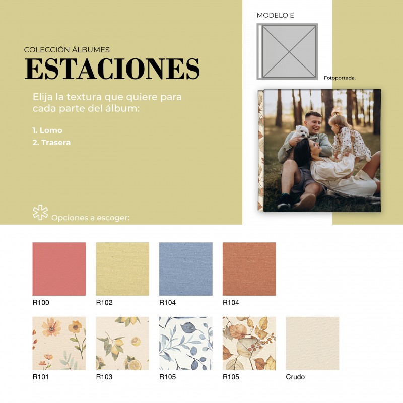 El Álbum Digital Estaciones es una opción cuidada y versátil para quienes buscan un acabado elegante y totalmente personalizable. Su diseño permite combinar diferentes texturas en portada, lomo y trasera, adaptándose al estilo de cada proyecto. Además, puede realizarse con o sin cinta decorativa, la cual puede ir personalizada con nombre, aportando un detalle único y especial.