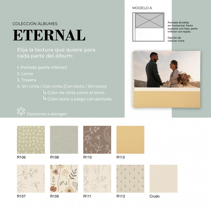 El Álbum Digital Eternal es una opción cuidada y versátil para quienes buscan un acabado elegante y totalmente personalizable. Su diseño permite combinar diferentes texturas en portada, lomo y trasera, adaptándose al estilo de cada proyecto. Además, puede realizarse con o sin cinta decorativa, la cual puede ir personalizada con nombre, aportando un detalle único y especial.