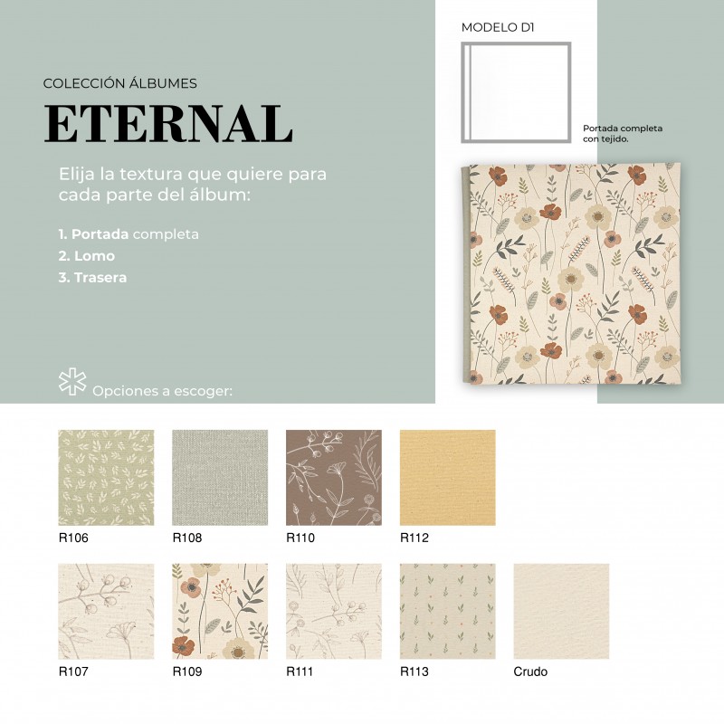 El Álbum Digital Eternal es una opción cuidada y versátil para quienes buscan un acabado elegante y totalmente personalizable. Su diseño permite combinar diferentes texturas en portada, lomo y trasera, adaptándose al estilo de cada proyecto. Además, puede realizarse con o sin cinta decorativa, la cual puede ir personalizada con nombre, aportando un detalle único y especial.