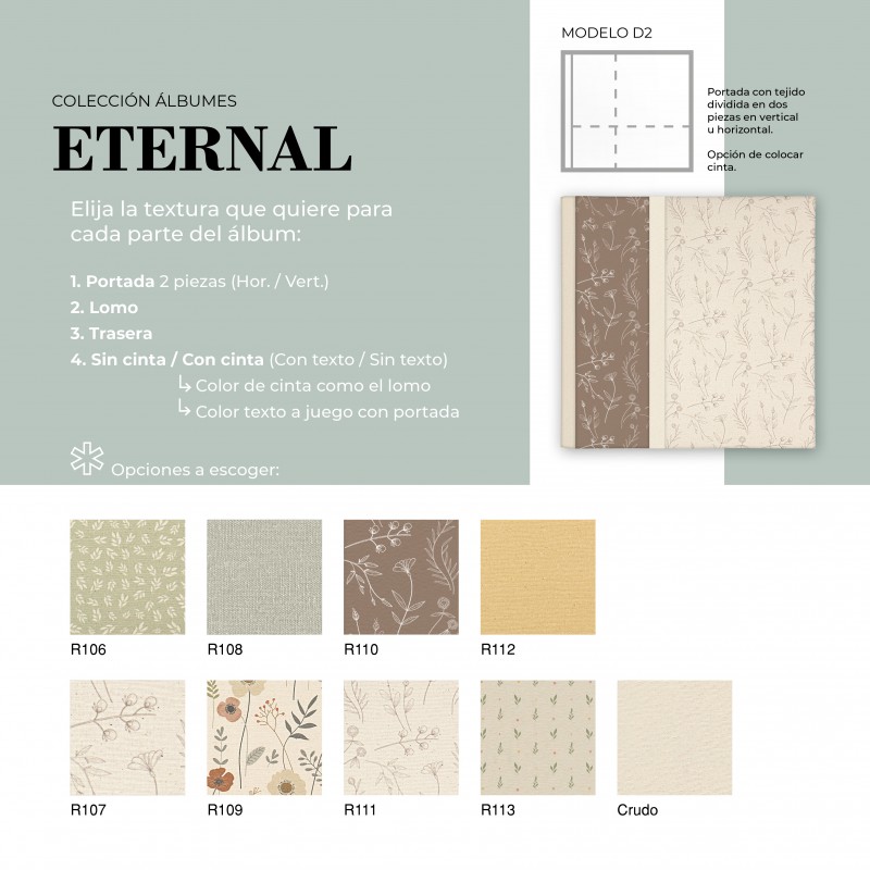 El Álbum Digital Eternal es una opción cuidada y versátil para quienes buscan un acabado elegante y totalmente personalizable. Su diseño permite combinar diferentes texturas en portada, lomo y trasera, adaptándose al estilo de cada proyecto. Además, puede realizarse con o sin cinta decorativa, la cual puede ir personalizada con nombre, aportando un detalle único y especial.