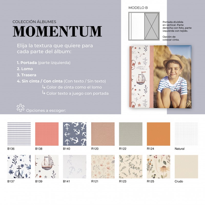 El Álbum Digital Momentum es una opción cuidada y versátil para quienes buscan un acabado elegante y totalmente personalizable. Su diseño permite combinar diferentes texturas en portada, lomo y trasera, adaptándose al estilo de cada proyecto. Además, puede realizarse con o sin cinta decorativa, la cual puede ir personalizada con nombre, aportando un detalle único y especial.