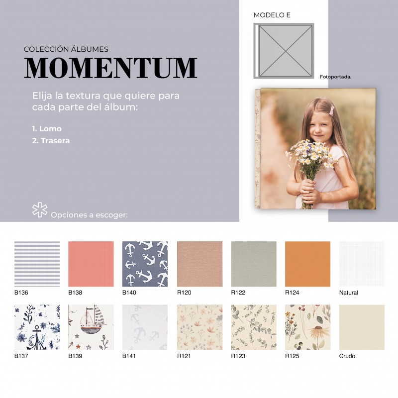 El Álbum Digital Momentum es una opción cuidada y versátil para quienes buscan un acabado elegante y totalmente personalizable. Su diseño permite combinar diferentes texturas en portada, lomo y trasera, adaptándose al estilo de cada proyecto. Además, puede realizarse con o sin cinta decorativa, la cual puede ir personalizada con nombre, aportando un detalle único y especial.