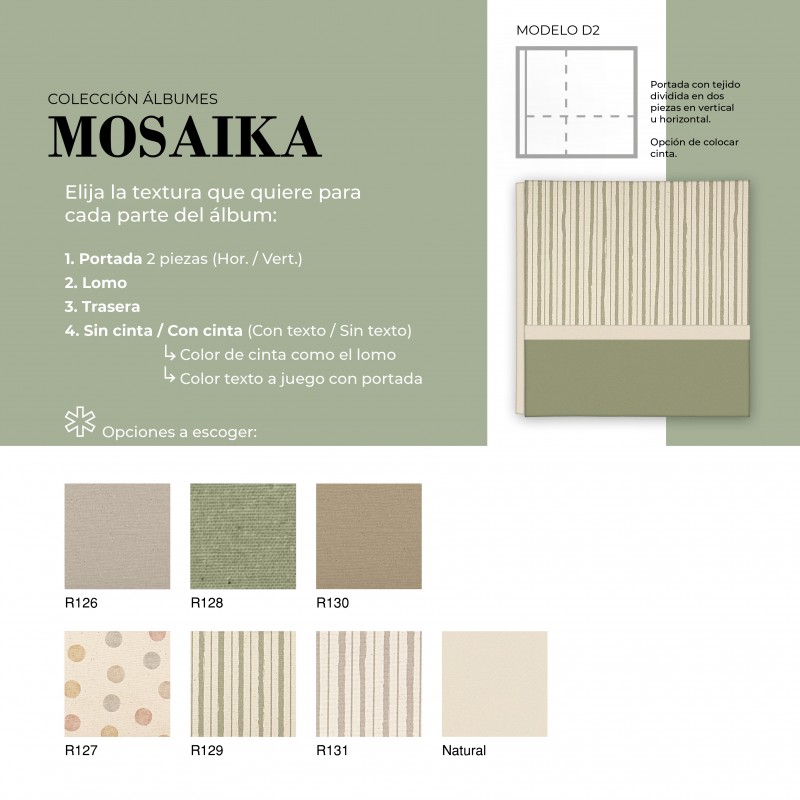 El Álbum Digital Mosaika es una opción cuidada y versátil para quienes buscan un acabado elegante y totalmente personalizable. Su diseño permite combinar diferentes texturas en portada, lomo y trasera, adaptándose al estilo de cada proyecto. Además, puede realizarse con o sin cinta decorativa, la cual puede ir personalizada con nombre, aportando un detalle único y especial.