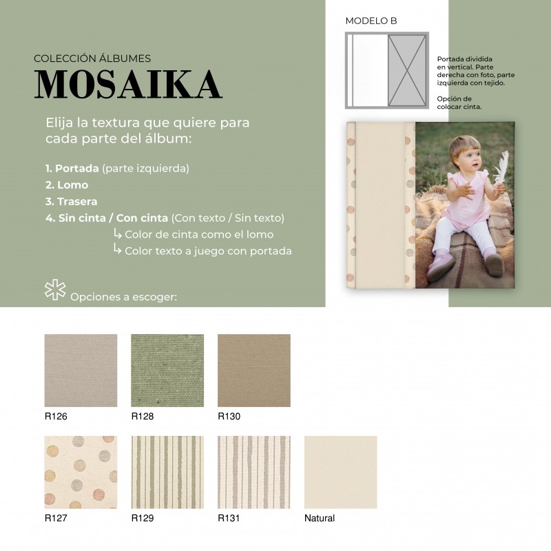 El Álbum Digital Mosaika es una opción cuidada y versátil para quienes buscan un acabado elegante y totalmente personalizable. Su diseño permite combinar diferentes texturas en portada, lomo y trasera, adaptándose al estilo de cada proyecto. Además, puede realizarse con o sin cinta decorativa, la cual puede ir personalizada con nombre, aportando un detalle único y especial.