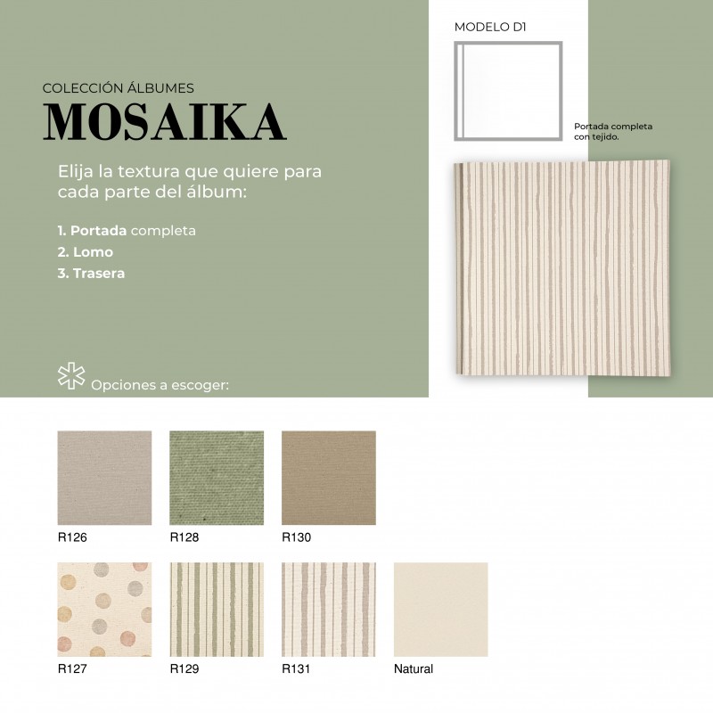 El Álbum Digital Mosaika es una opción cuidada y versátil para quienes buscan un acabado elegante y totalmente personalizable. Su diseño permite combinar diferentes texturas en portada, lomo y trasera, adaptándose al estilo de cada proyecto. Además, puede realizarse con o sin cinta decorativa, la cual puede ir personalizada con nombre, aportando un detalle único y especial.