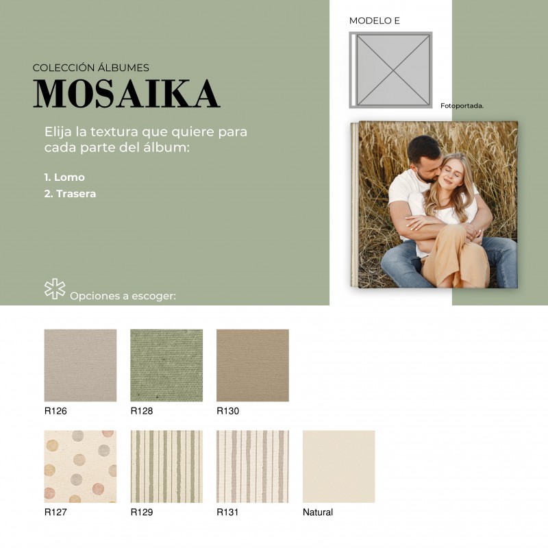 El Álbum Digital Mosaika es una opción cuidada y versátil para quienes buscan un acabado elegante y totalmente personalizable. Su diseño permite combinar diferentes texturas en portada, lomo y trasera, adaptándose al estilo de cada proyecto. Además, puede realizarse con o sin cinta decorativa, la cual puede ir personalizada con nombre, aportando un detalle único y especial.