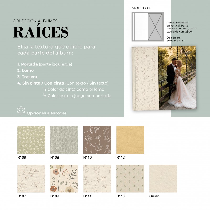 El Álbum Digital Raíces es una opción cuidada y versátil para quienes buscan un acabado elegante y totalmente personalizable. Su diseño permite combinar diferentes texturas en portada, lomo y trasera, adaptándose al estilo de cada proyecto. Además, puede realizarse con o sin cinta decorativa, la cual puede ir personalizada con nombre, aportando un detalle único y especial.