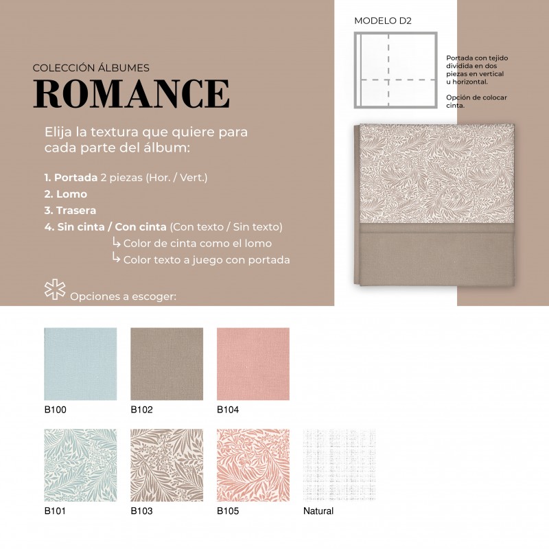El Álbum Digital Romance es una opción cuidada y versátil para quienes buscan un acabado elegante y totalmente personalizable. Su diseño permite combinar diferentes texturas en portada, lomo y trasera, adaptándose al estilo de cada proyecto. Además, puede realizarse con o sin cinta decorativa, la cual puede ir personalizada con nombre, aportando un detalle único y especial.
