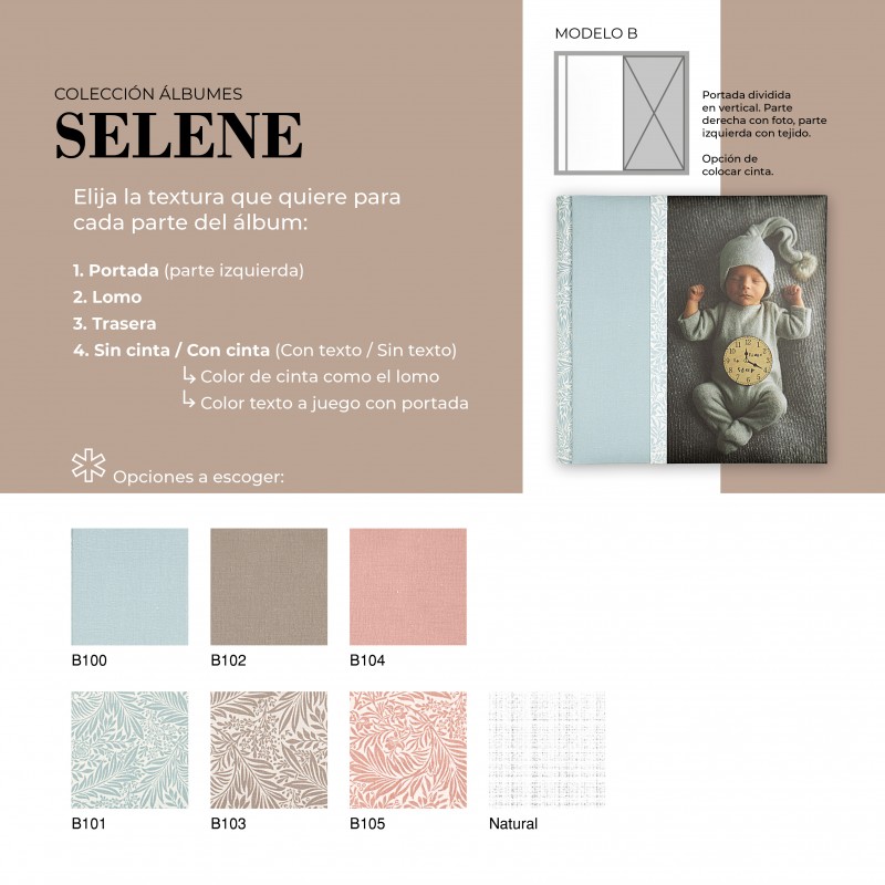 El Álbum Digital SELENE es una opción cuidada y versátil para quienes buscan un acabado elegante y totalmente personalizable. Su diseño permite combinar diferentes texturas en portada, lomo y trasera, adaptándose al estilo de cada proyecto. Además, puede realizarse con o sin cinta decorativa, la cual puede ir personalizada con nombre, aportando un detalle único y especial.