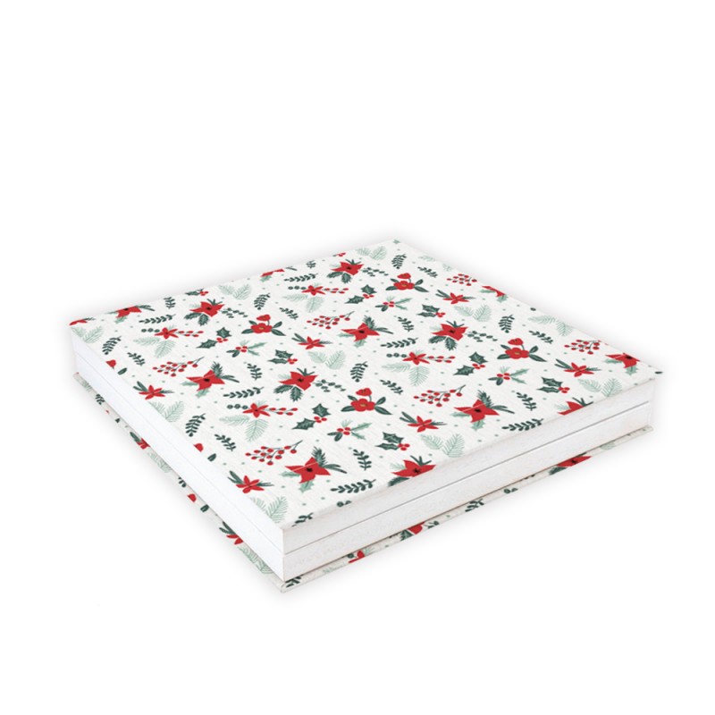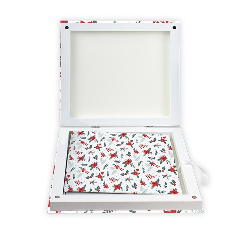 Caja de madera con interior en madera blanca y trasera en material lino impreso.