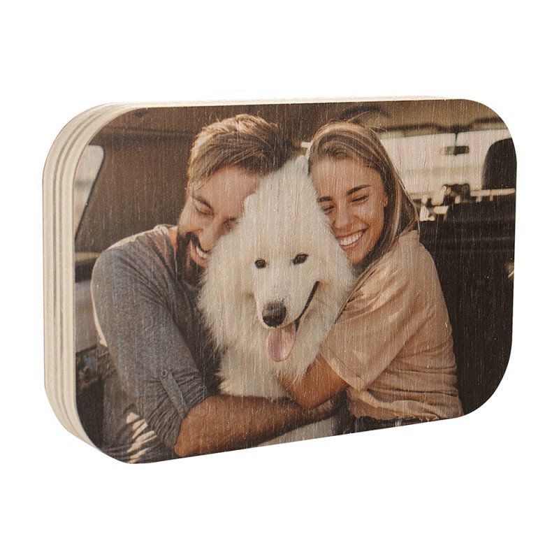 Figura de Madera de 19MM en forma rectangular o cuadrada con cantos redondeados, método de impresión directa mediante tintas UV.